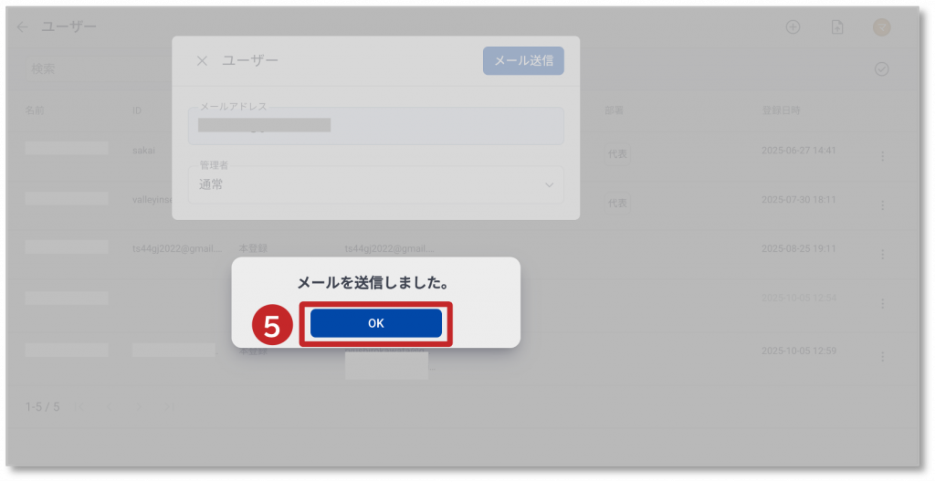 ④ 「メール送信」をクリックして、追加するユーザーにメールを送信します。
