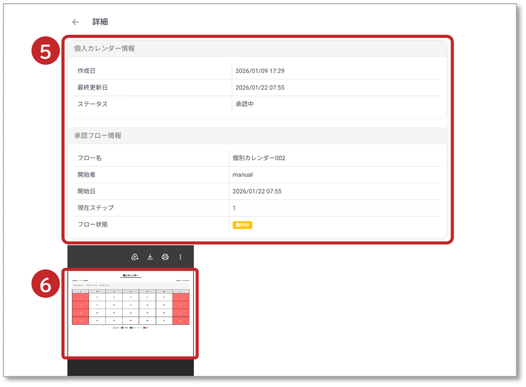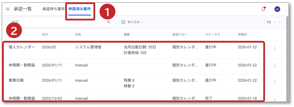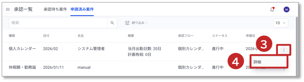 操作メニュー 承認一覧 6. 申請済み案件 申請済み案件について説明します。 ①「申請済み案件」が選択されています。 ② 申請済み案件一覧が表示されます。 ③「︙」をクリックします。 ④「詳細」をクリックすると申請済み案件が表示されます。 ⑤ 申請済み案件の内容が表示されます。 ⑥ 申請内容のPDF表示されます。