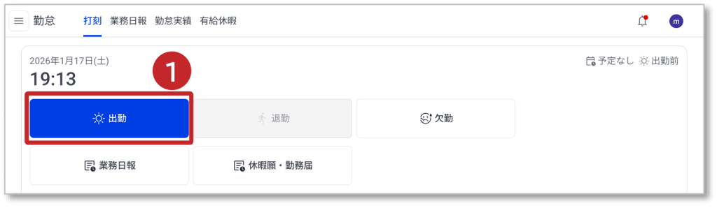 ① 出勤した際は「出勤」をクリックすると、打刻画面が表示されます。