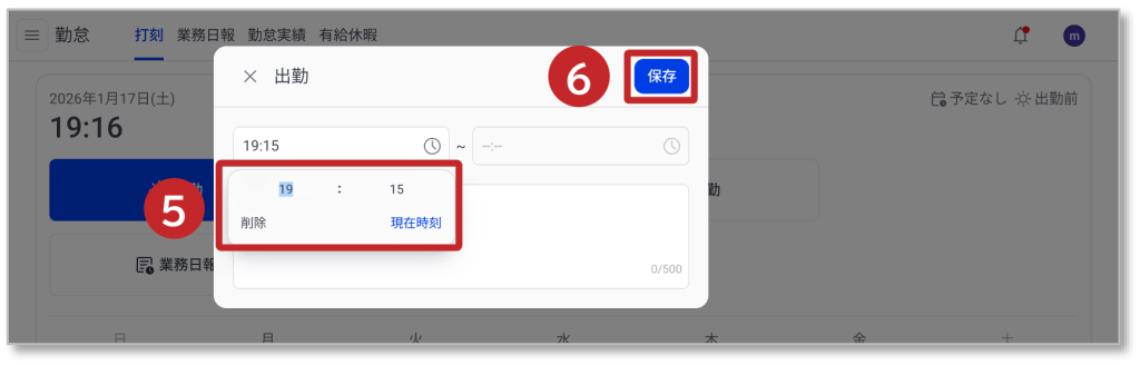 ⑥ 修正が完了したら「保存」をクリックして、打刻時間を登録します。