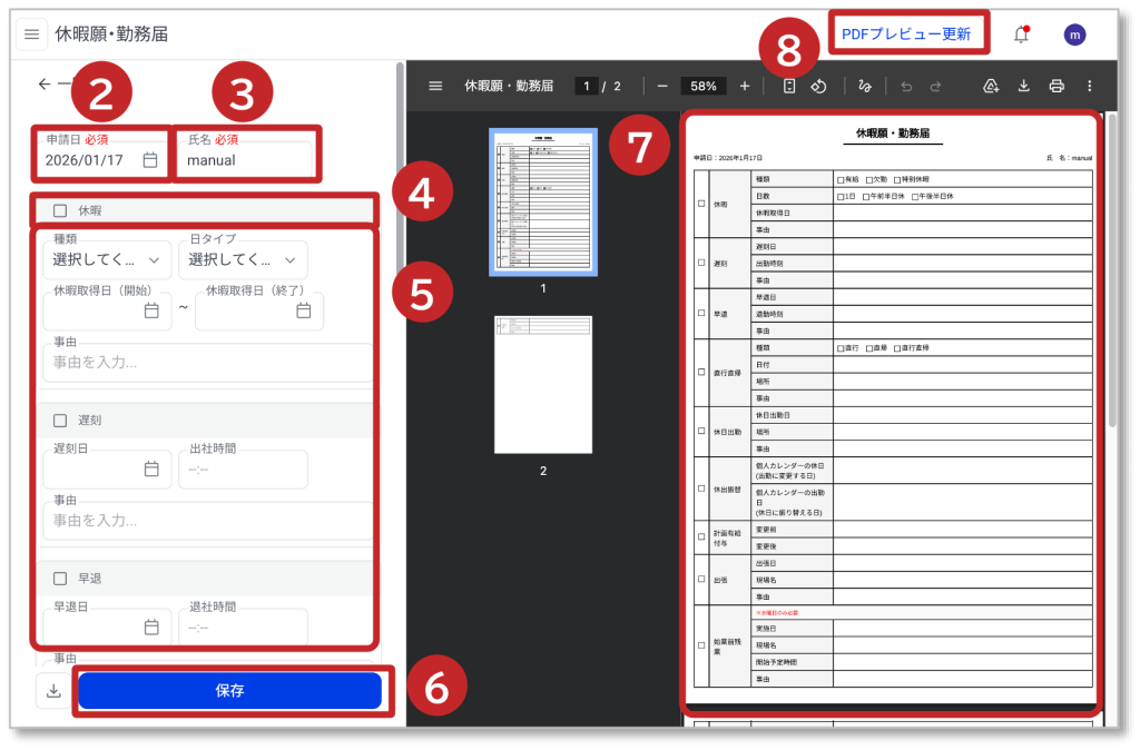 ⑧「PDFプレビュー更新」をクリックするとPDFが最新の登録情報に更新されます。
