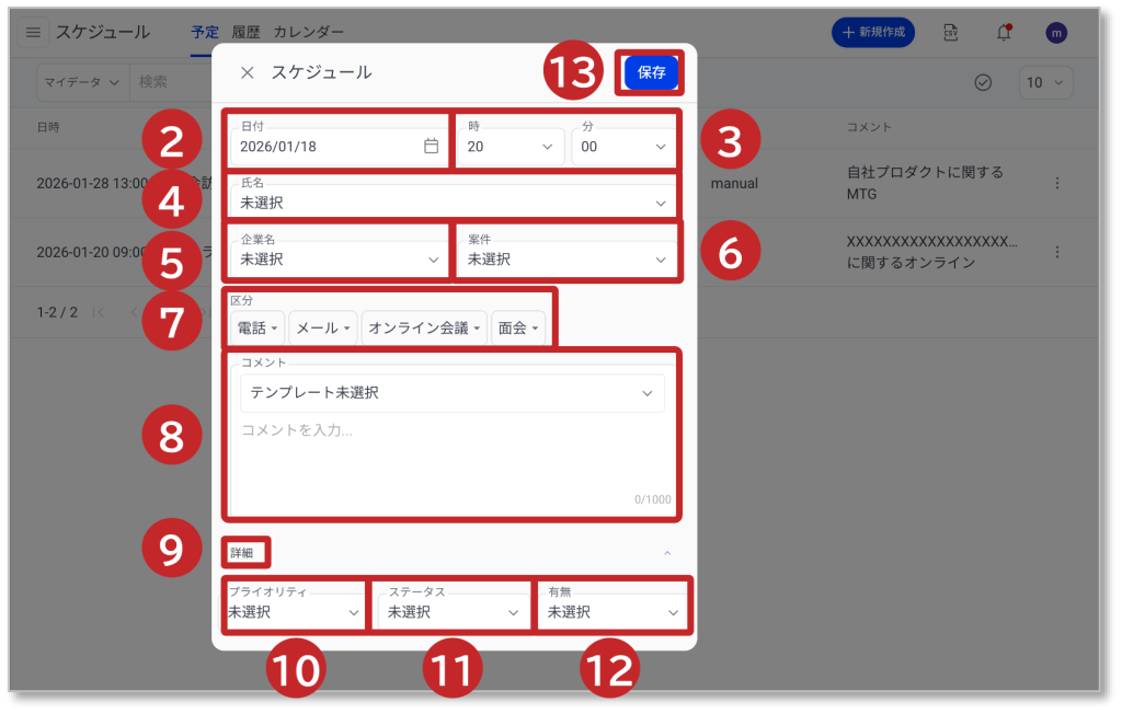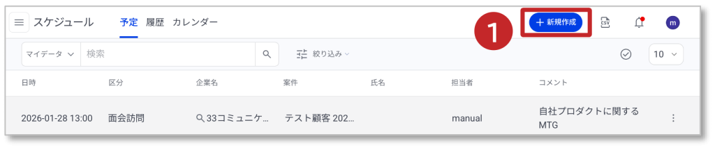 ①「+新規作成」をクリックするとスケジュールの新規作成画面が表示されます。
