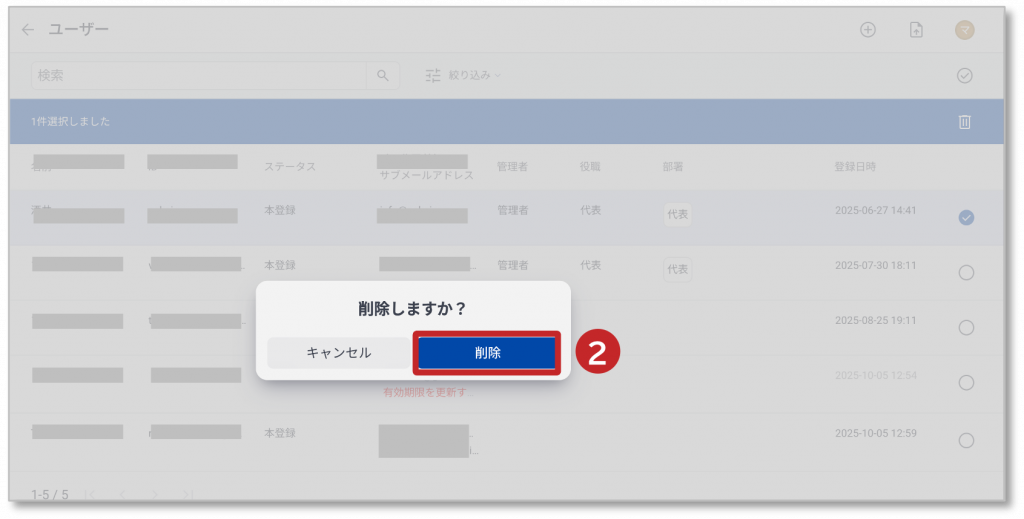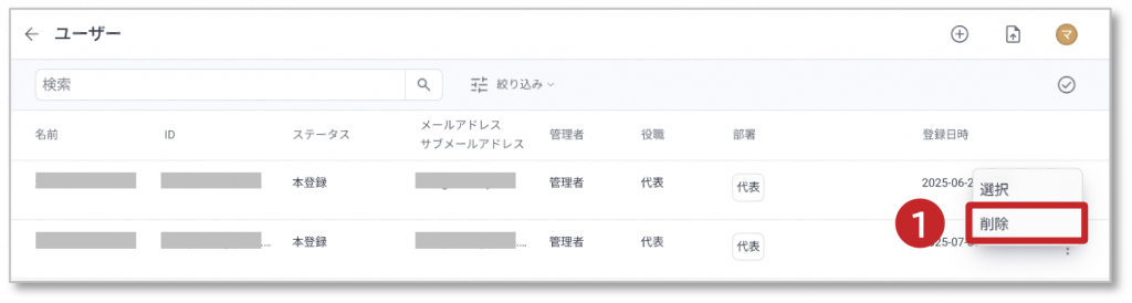 管理者メニュー ユーザー 3. ユーザーの削除 ユーザーの削除方法を説明します。 ① 「︙」をクリックし、「削除」をクリックします。 ② ダイアログが表示され、「削除」をクリックすると、選択されたユーザーが削除されます。