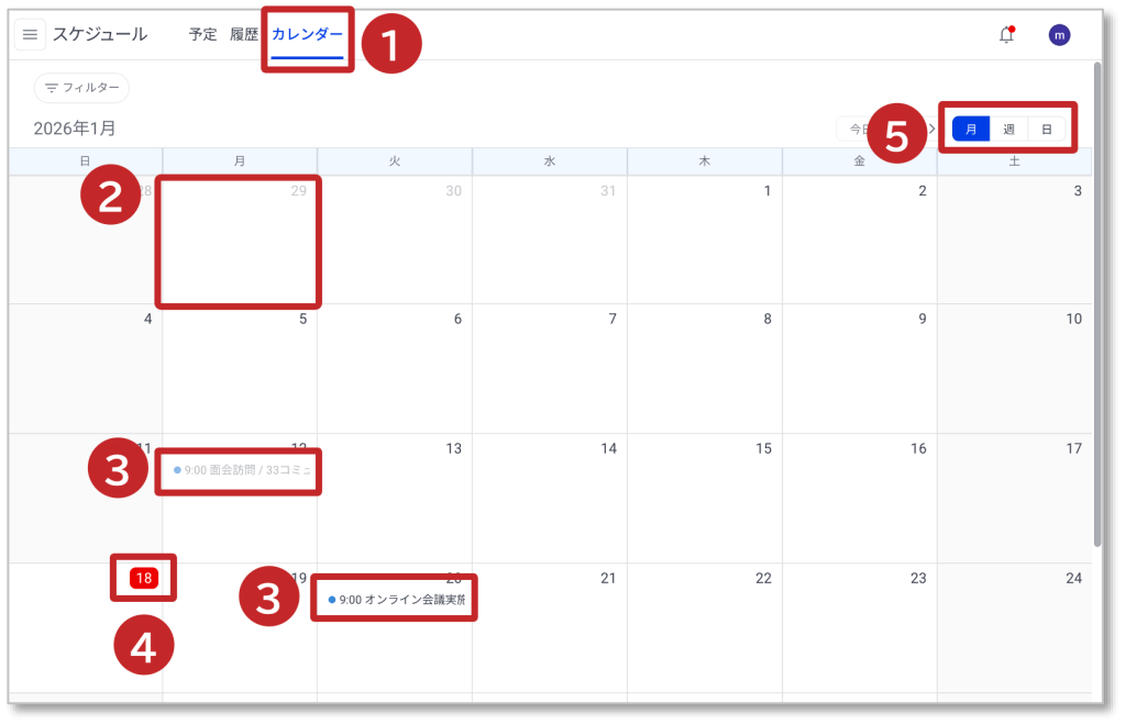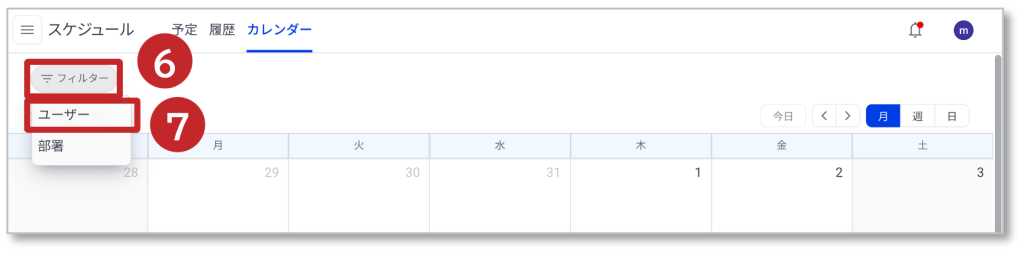 ⑤ 表示期間は「月/週/日」をクリックすると表示が変わります。