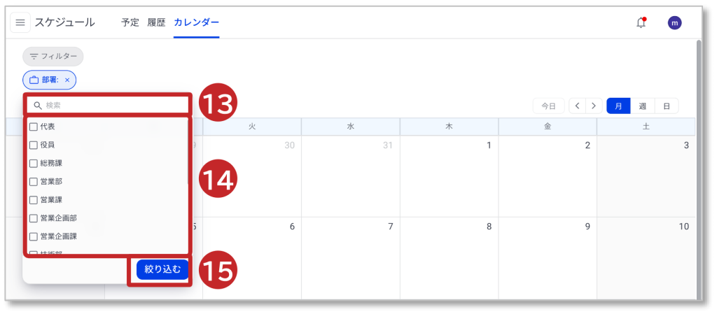 15.「絞り込む」をクリックして部署を絞り込みます。