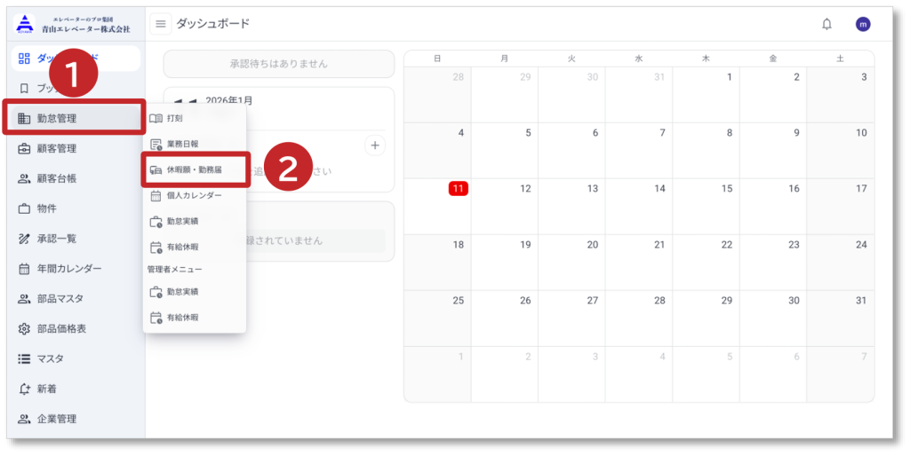 ① 左メニューの「勤怠管理」をクリックすると、右メニューが表示されます。