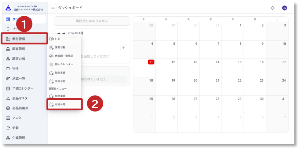 ① 左メニューの「勤怠管理」をクリックすると、右メニューが表示されます。