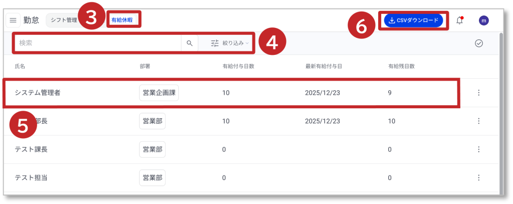 ⑥「CSVダウンロード」をクリックすると社員の有給休暇一覧がCSVでダウンロードできます。