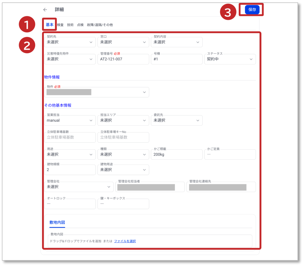 操作メニュー 顧客台帳 2. 基本情報の表示 基本情報の表示方法について説明します。 ①「基本」情報が表示されます。その他「検査・技術・点検・故障/遠隔/その他」それぞれをクリックすると対象の情報が表示されます。 ② 登録されている情報が表示されます。編集も可能です。 ③「保存」をクリックすると編集内容が保存されます。