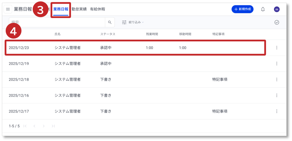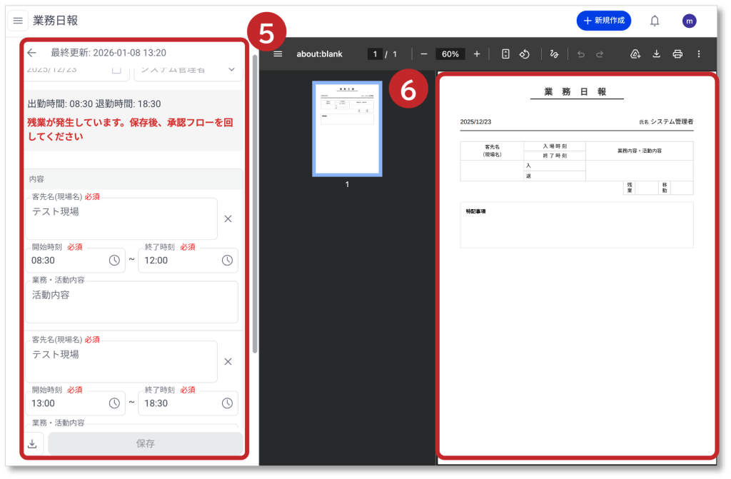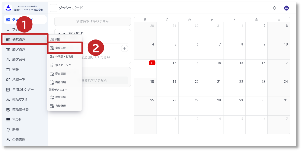 操作メニュー 勤怠管理 1. 業務日報の表示 業務日報の表示について説明します。 ① 左メニューの「勤怠管理」をクリックすると、右メニューが表示されます。 ②「業務日報」をクリックします。 ③「業務日報」の一覧が表示されます。 ④ 日別の業務日報が表示されます。 ⑤ 登録されている業務日報の内容が表示されます。 ⑥ 登録されている業務日報が書類形式で表示されます。※書類形式で表示されている業務日報は右上のダウンロード、印刷ボタンからそれぞれ行えます。※承認中の業務日報は編集できません。