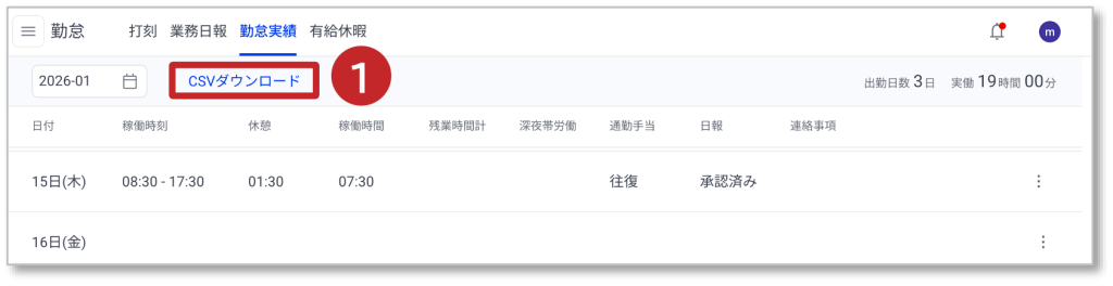 操作メニュー 勤怠管理 4. 勤怠実績のCSVダウンロード 勤怠実績のCSVダウンロード方法について説明します。 ①「CSVダウンロード」をクリックすると、画面表示されている対象月のCSVファイルがダウンロードされます。