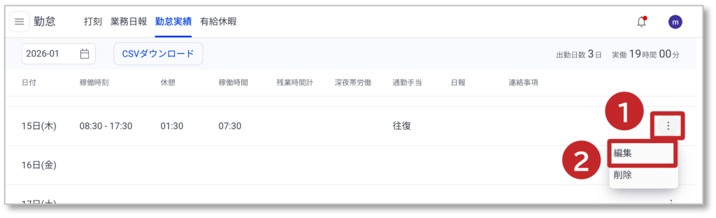 2. 勤怠実績の編集