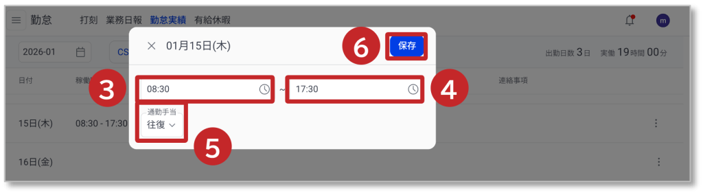 ③ 出勤時間を編集できます。