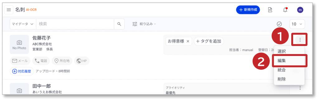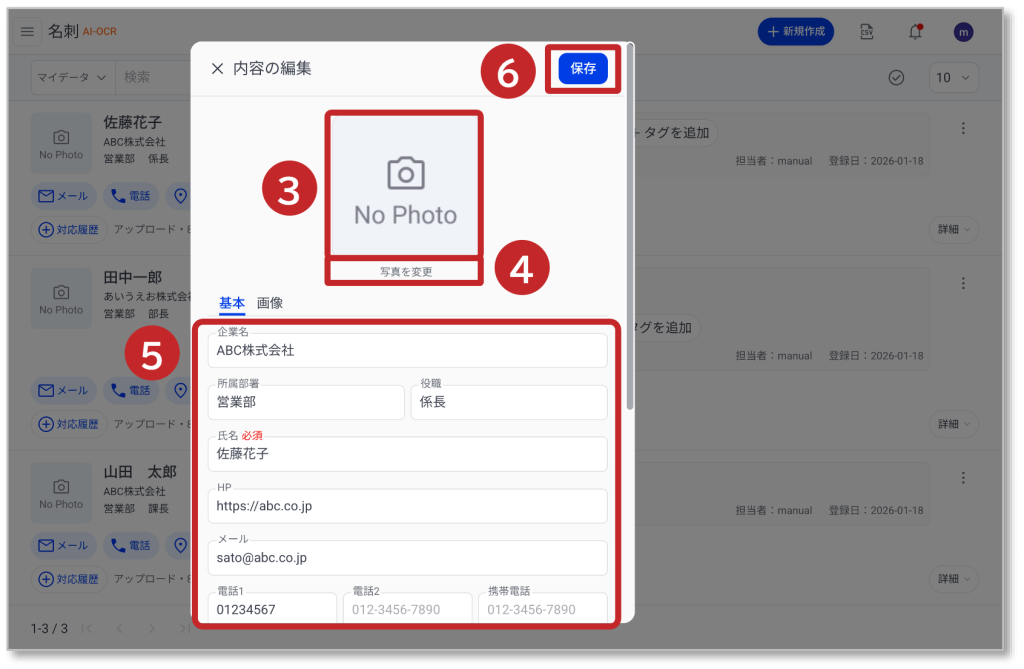 操作メニュー 顧客管理 6. 名刺の編集 名刺の編集方法について説明します。 ①「︙」をクリックします。 ②「編集」をクリックします。 ③「画像」をクリックすると登録されている画像が表示されます。 ④「写真を変更」をクリックするとお使いのPCのファイルから写真を選択して、画像を設定できます。 ⑤ 登録している名刺情報の修正、追加が行えます。 ⑥「保存」をクリックすると新たに編集した情報が保存されます。