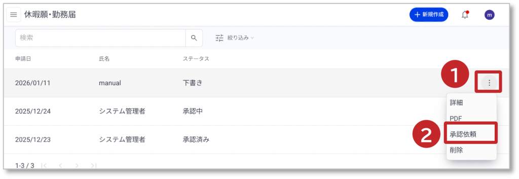 休暇願・勤務届の承認依頼方法について説明します。