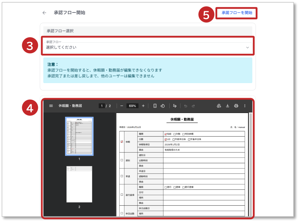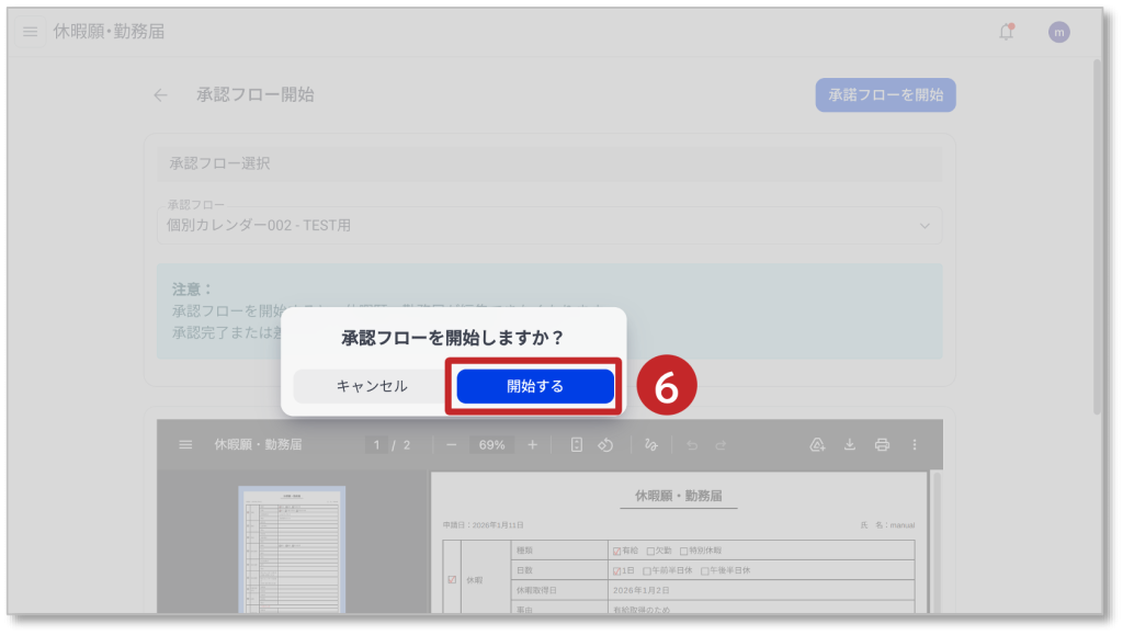 ⑤「承認フローを開始」をクリックすると確認ダイアログが表示されます。