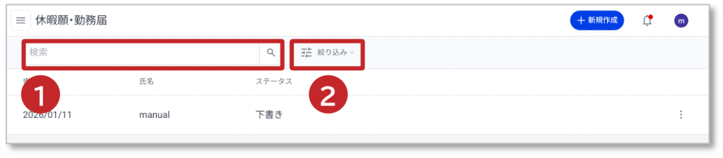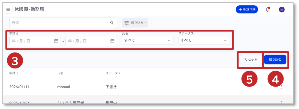 操作メニュー 勤怠管理 7. 休暇願・勤務届の検索・絞り込み 休暇願・勤務届の検索・絞り込み方法について説明します。 ① キーワードを入力して「虫眼鏡アイコン」をクリックして検索します。 ②「絞り込み」をクリックすると、絞り込み条件が表示されます。 ③ 絞り込み条件を設定します。 ④「絞り込む」をクリックすると、指定条件で絞り込みます。 ⑤「リセット」をクリックすると指定条件がリセットされます。