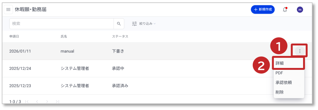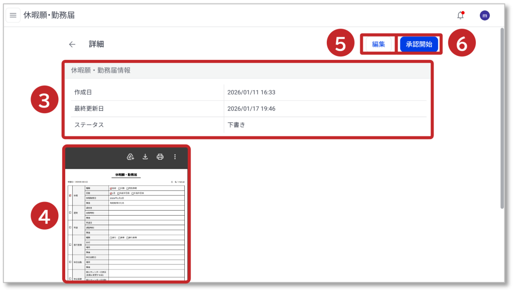 操作メニュー 勤怠管理 2. 休暇願・勤務届の詳細表示 休暇願・勤務届の詳細表示方法について説明します。 ①「︙」アイコンをクリックするとメニューが表示されます。 ②「詳細」をクリックすると対象の休暇願・勤務届の詳細画面が開きます。 ③ 登録されている休暇願・勤務届内容が表示されます。 ④ 登録内容がフォーマットで表示されます。 ⑤「編集」をクリックすると内容を編集可能です。 ⑥「承認開始」をクリックすると承認画面が開きます。
