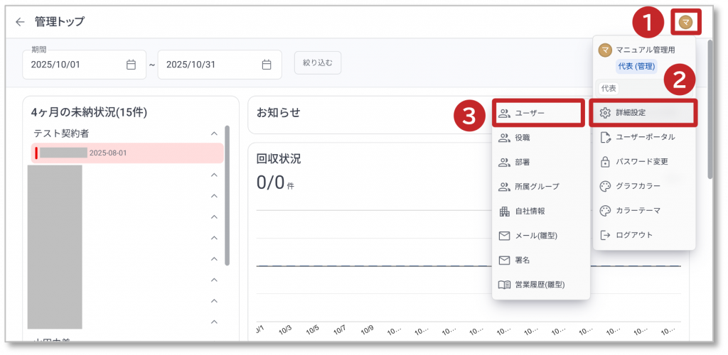 ③ 表示されたメニューの「ユーザー」をクリックしてユーザー設定画面を表示します。